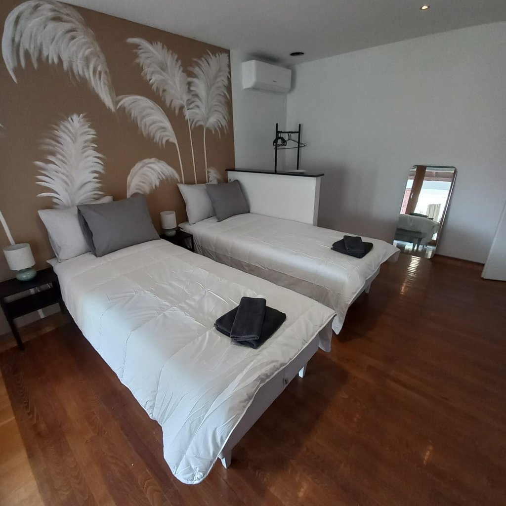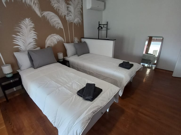 Prostrana soba sa dva kreveta i privatnom terasom, savršeno za duži boravak i uživanje na svežem vazduhu. Svetla i prijatna.